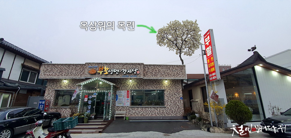 부활식당의 지붕위 활짝 핀 목련
