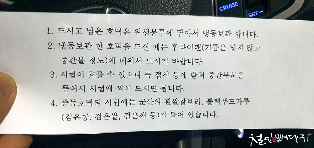 중동호떡은 기름에 튀기듯 굽는 것이 아닌, 기름 없이 굽는 방식입니다. 그래서 손에 기름이 묻지 않고 속은 뜨거울 시럽으로 채워져 있어서 방금 나온 호떡은 너무 뜨거워서 주의하라는 경고가 있습니다.
