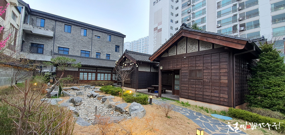 연못과 게스트하우스 건물 뒤로 아파트가 서있는 모습이 이색적이네요.