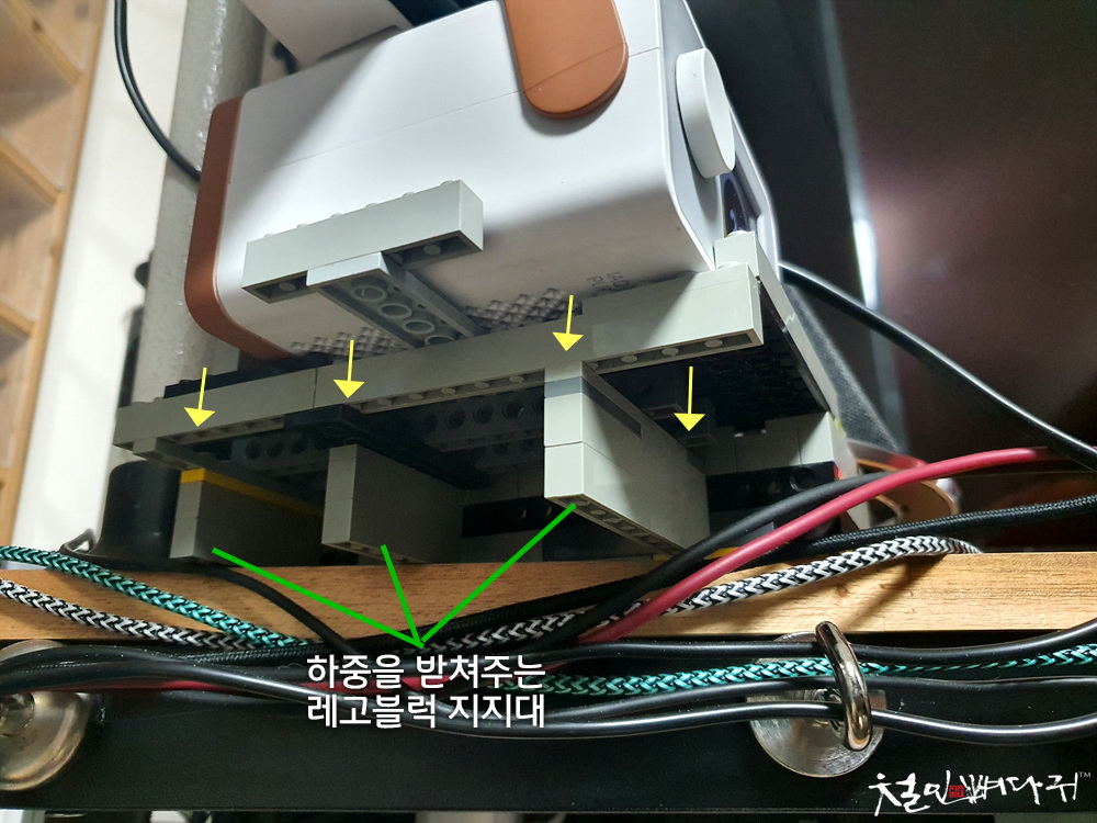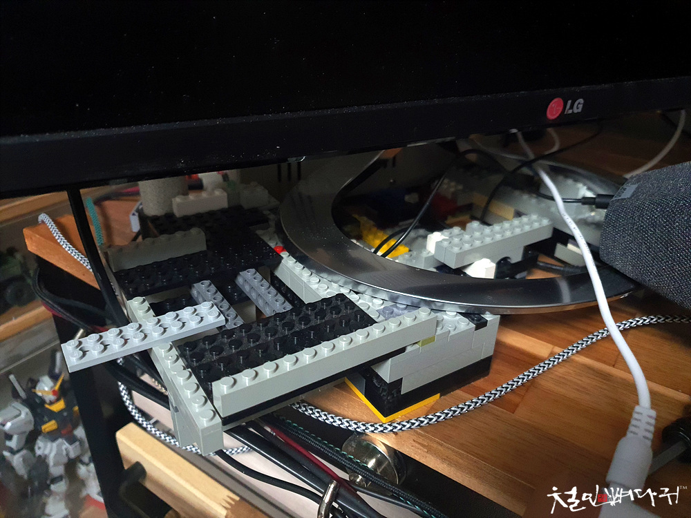 모니터를 사용하는 환경이 모니터 받침대가 책상 밖으로 나가야 하는 상황이라, 레고블럭 확장되는 부분 아래에 지지할 수 있는 구조로 레고블럭 긴것을 활용해 아래로 내려오는 하중을 분산시켰습니다.