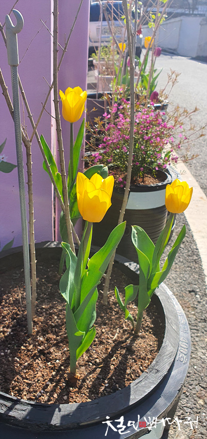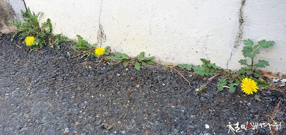 땅과 벽 사이 틈으로 민들레도 힘차게