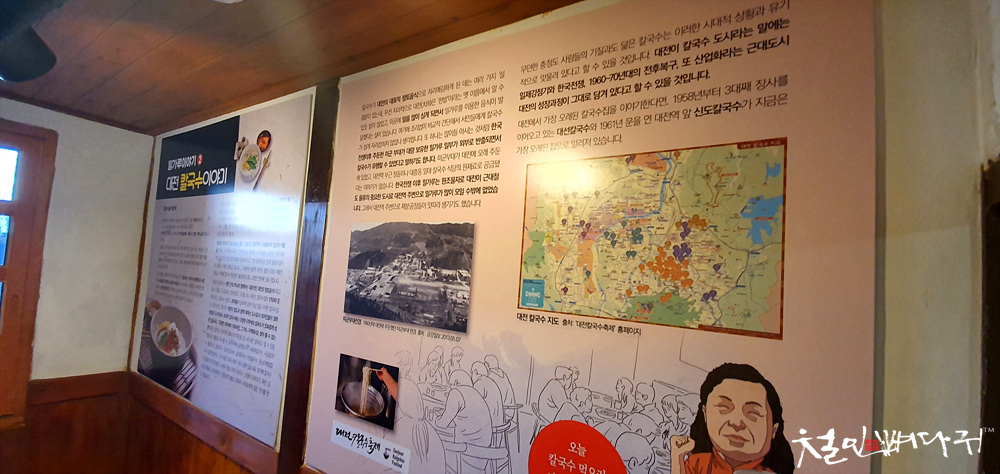 대전은 우리나라 철도운송의 중요 거점으로 대전역이 구호물자의 집산지 역할을 한데다, 6~70년대 대규모 간척사업 등 굵직한 국가사업에 동원된 근로자에게 노임으로 돈 대신 밀가루를 지급하게 되고, 분식장려운동 등과 맞물려 밀가루 유통의 거점이 됐다고 합니다. 그 덕분에 대전역 주변과 중앙시장을 비롯한 원도심 지역에 칼국수 전문점이 활성화 된 것도 그러한 연유에 있을 것입니다.