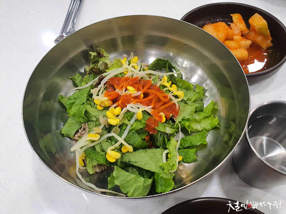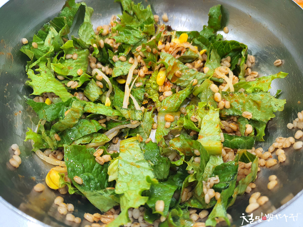 상추, 콩나물이 들어간 보리밥이 양은 적지만,