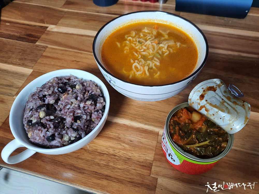 라면, 잡곡밥, 총각김치로 점심을 먹었습니다.
