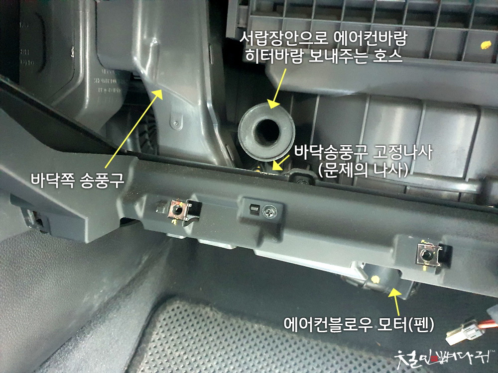 왼쪽의 바닥으로 향하는 송풍구가 걸려서