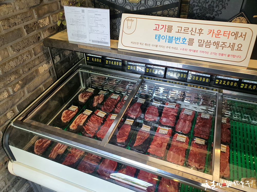 입구 들어서면, 고기를 쇼케이스에서 선택하고