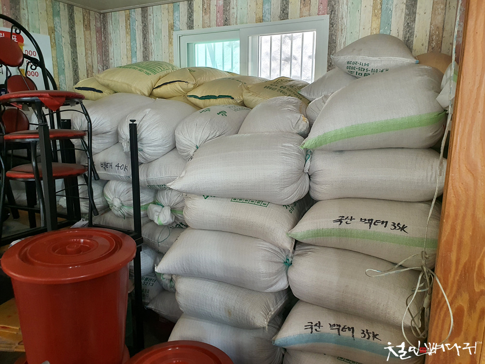 1층 안쪽 공간에 국산 백태 콩 자루들이