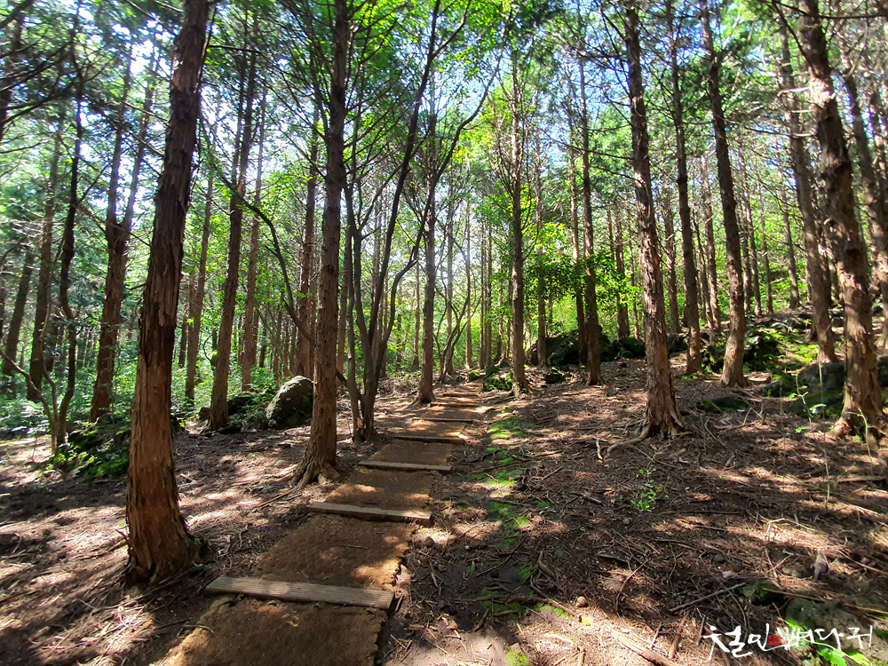 뜨거운 태양빛을 받으며 걷다가 삼나무숲으로