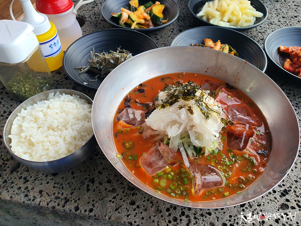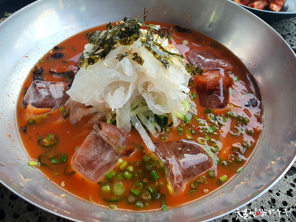 물회 국물은 고추장에 된장이 섞인 것을 사용한 듯