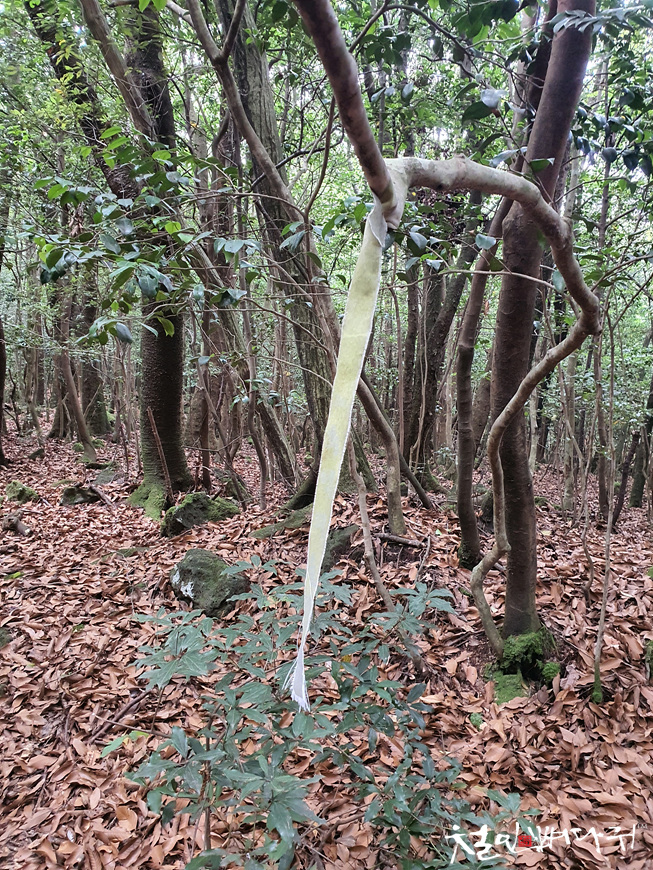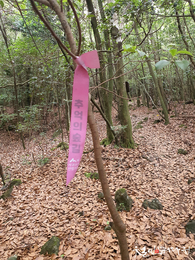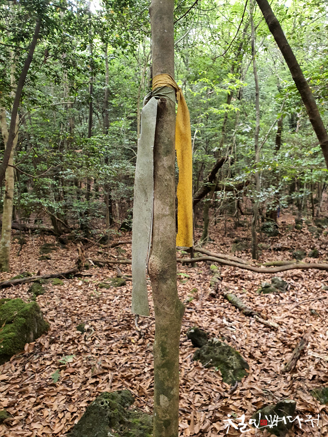 단체 홍보용 리본일 수 있기도 하지만, 깊은 숲길에서