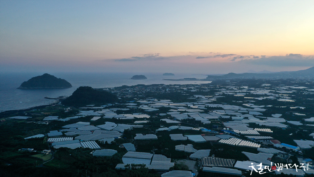 드론을 띄워 하늘에서 서쪽으로 지고 있는