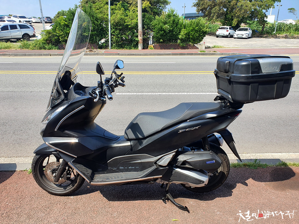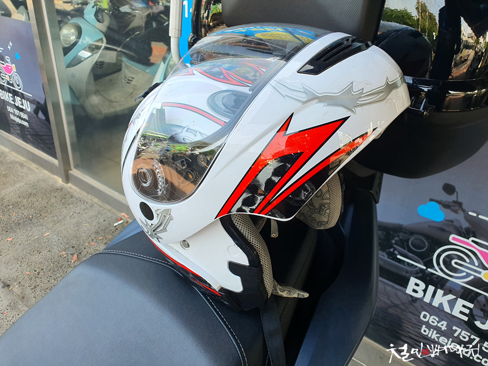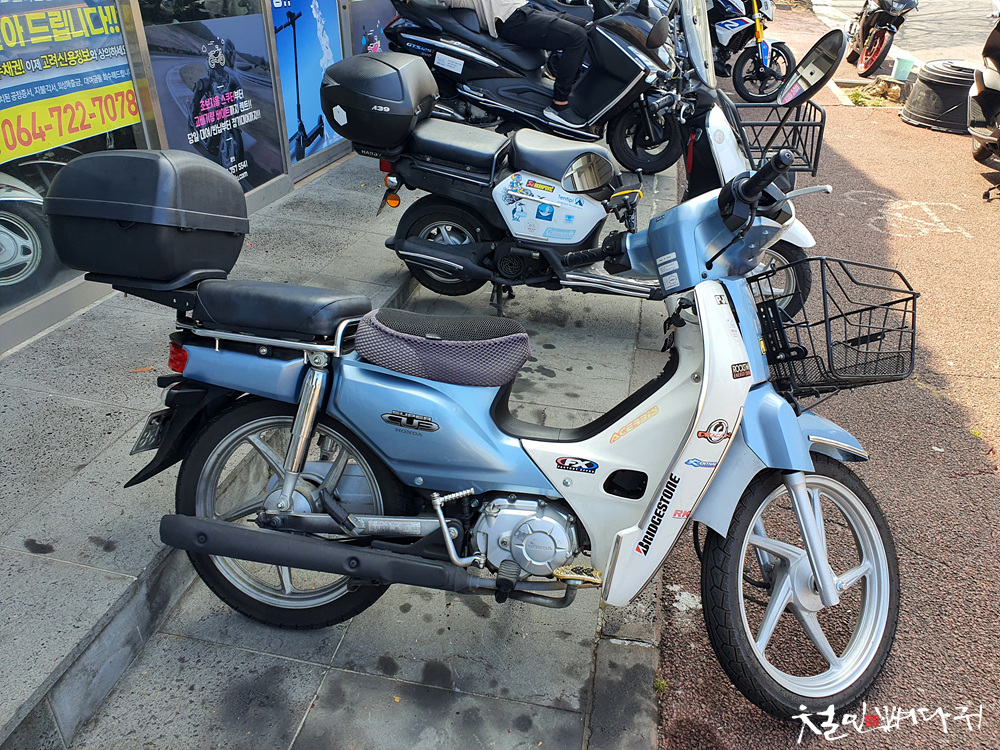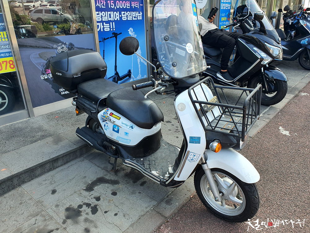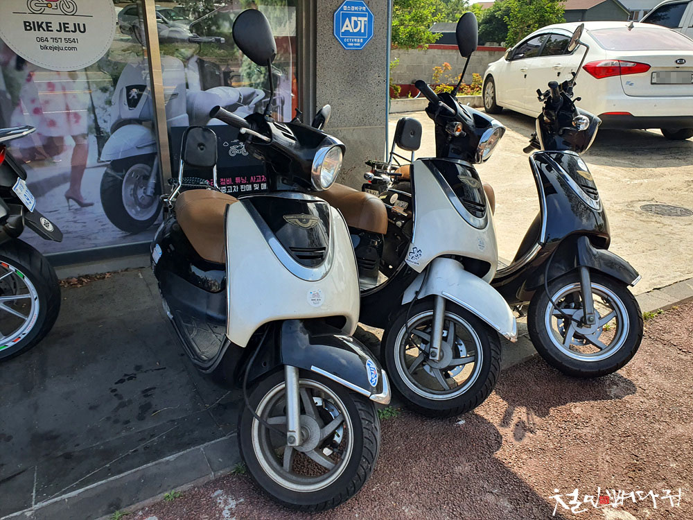 스쿠터를 빌려서 제주도 여행을 즐기고 있습니다.