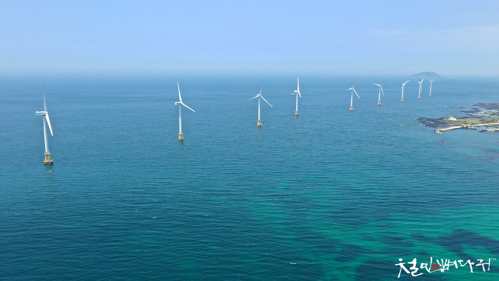 저 앞에 바다위에 있는 10개의 풍력발전기가