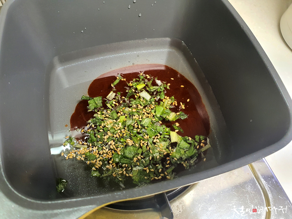 물에 소스와 건더기 수프를 넣고, 끓여준 후,