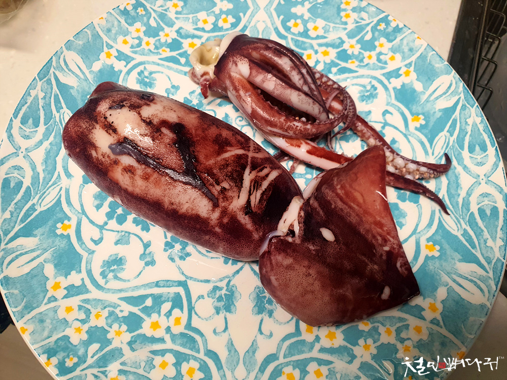 물 끓기 시작하면, 오징어 몸, 다리를 넣어서