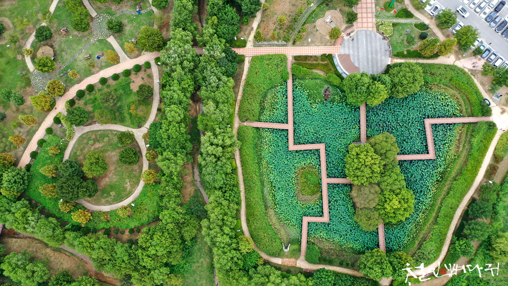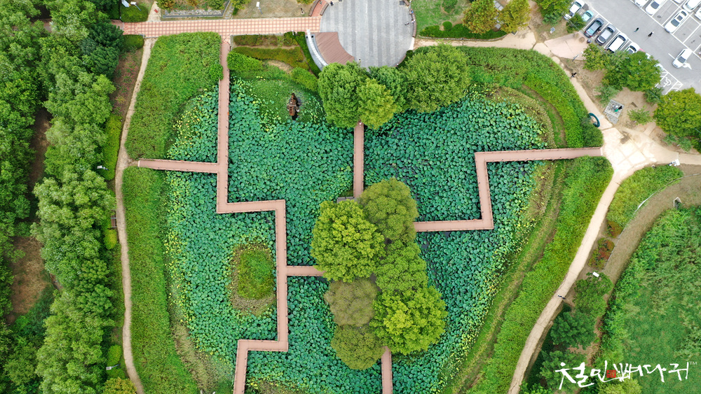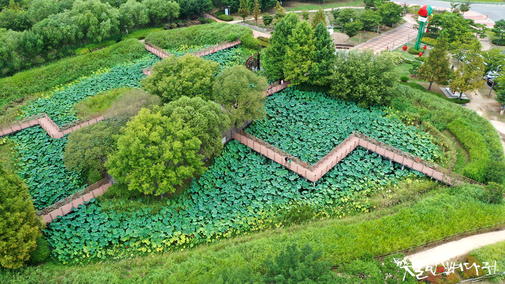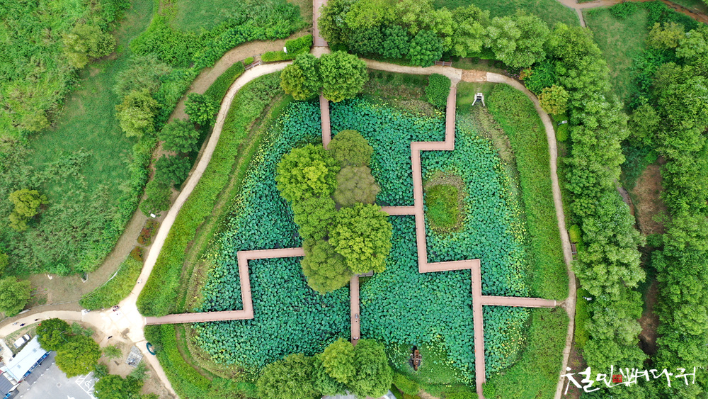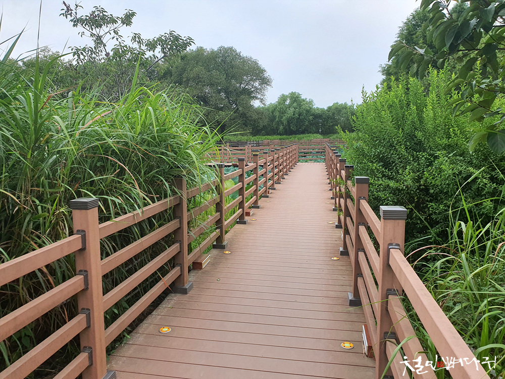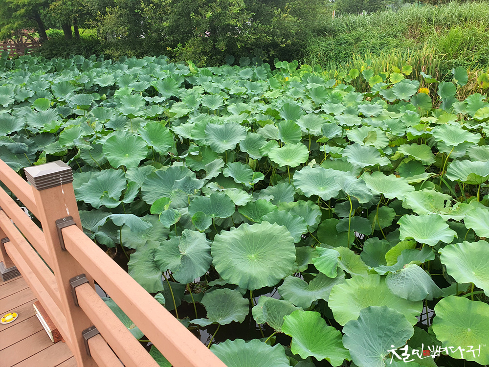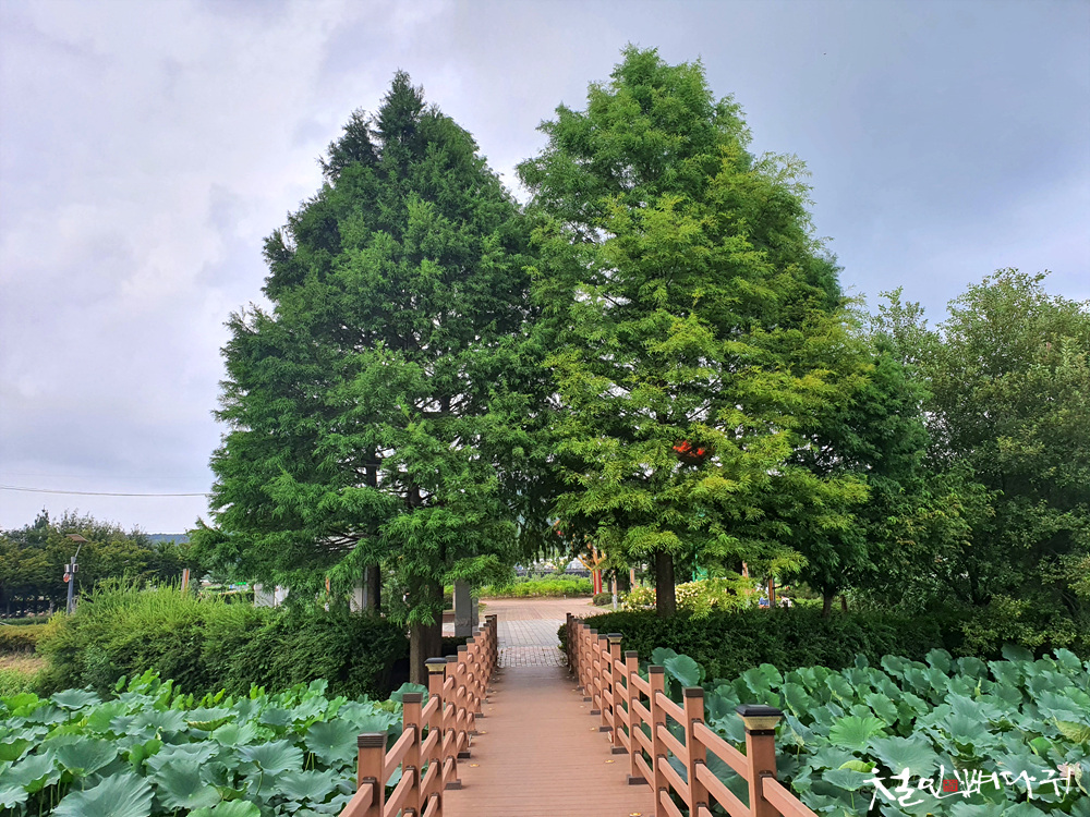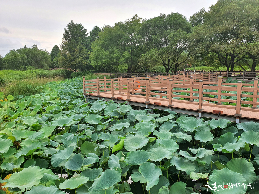 연잎이 가득한 곳 중간에 나무들과 데크로 된