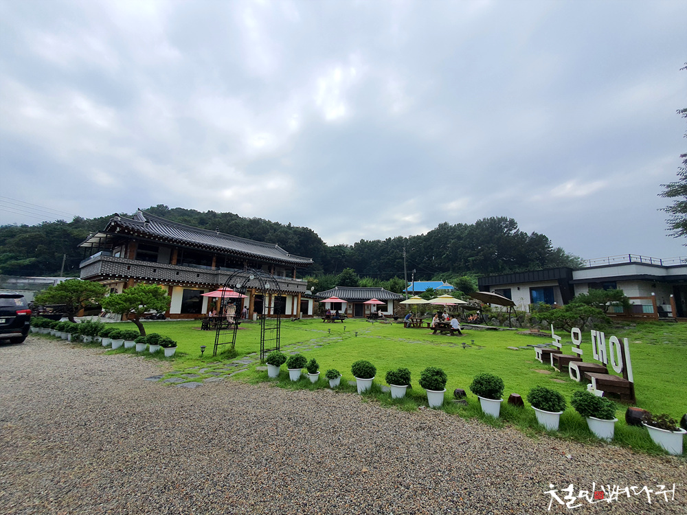 넓은 초록의 잔디와 2층 한옥 스타일의 카페가