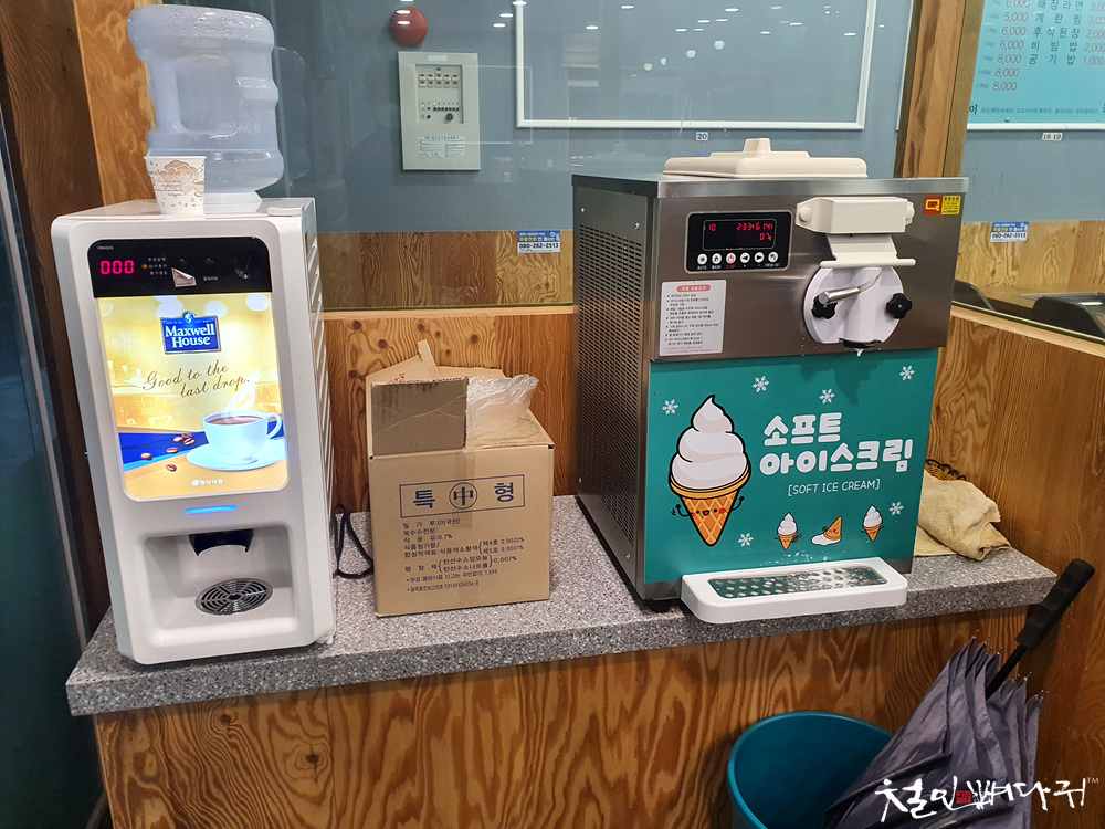 출입구에 커피자판기와 소프트 아이스크림