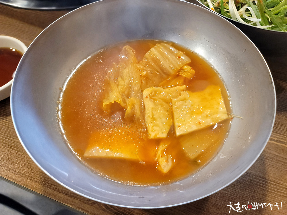 고기의 짭쪼름한 맛에 어묵김치국의 새콤함이