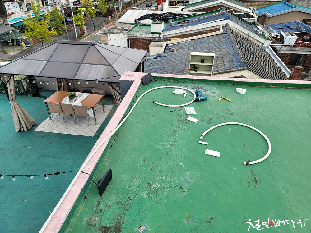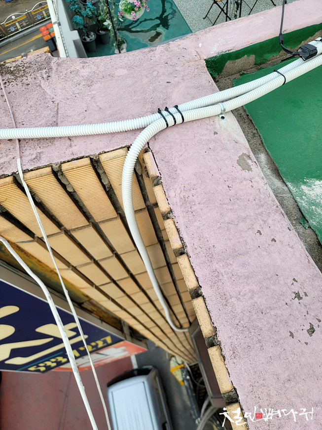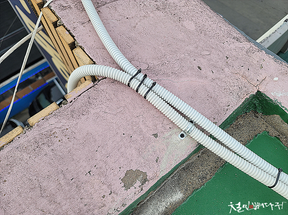 작업 끝난 옥상위, 배선들은 옥상 턱 위로