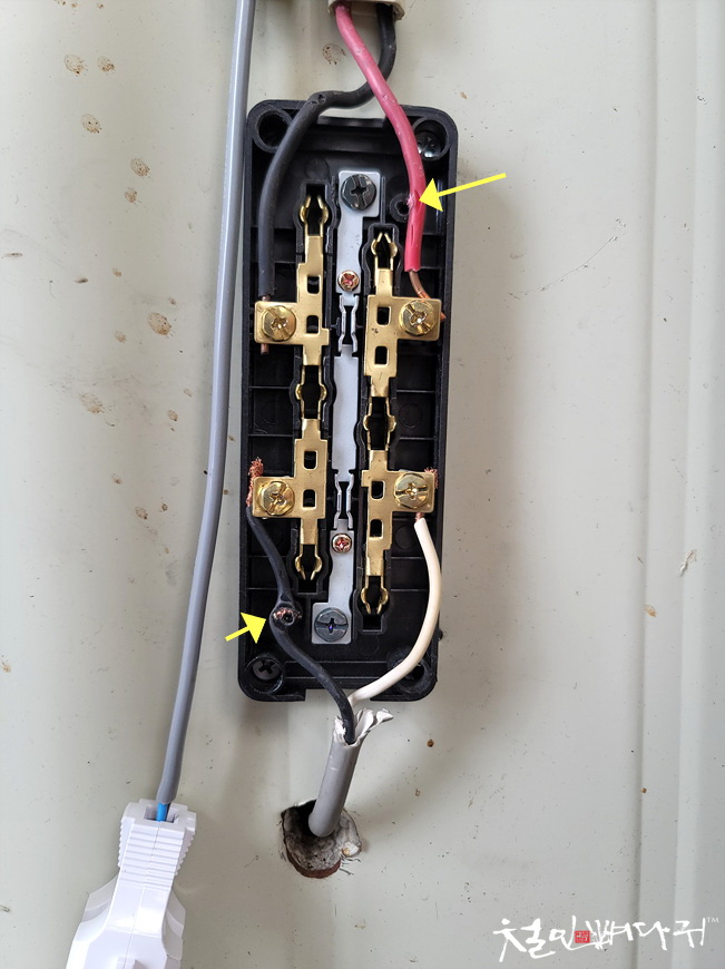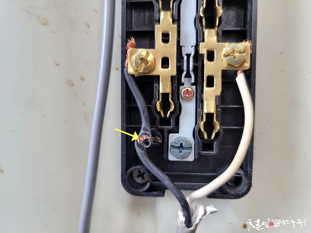 강제로 고정해서 전선이 뚫린 상태였습니다.