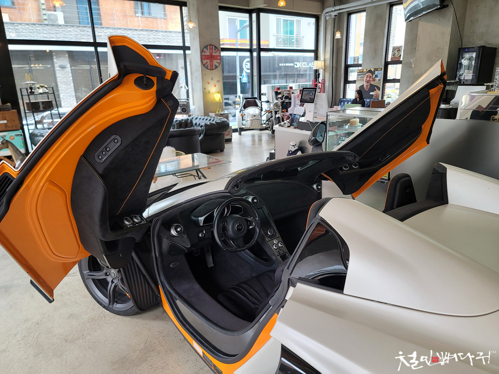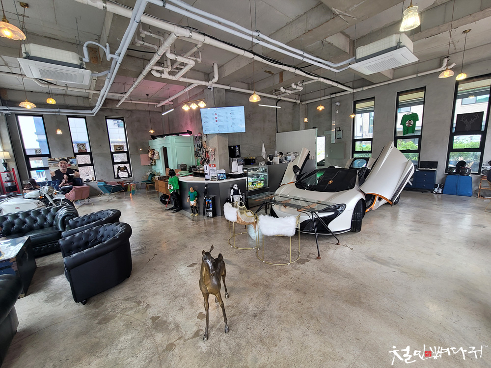 카페 히피 내부에는 오토바이 한 대와 슈퍼카 맥라렌이