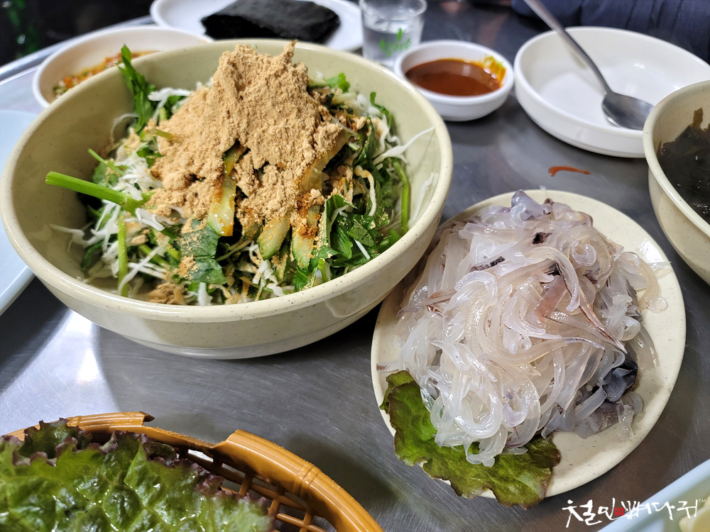 야채와 콩가루는 원래 숭어랑 먹을 때 곁들이는