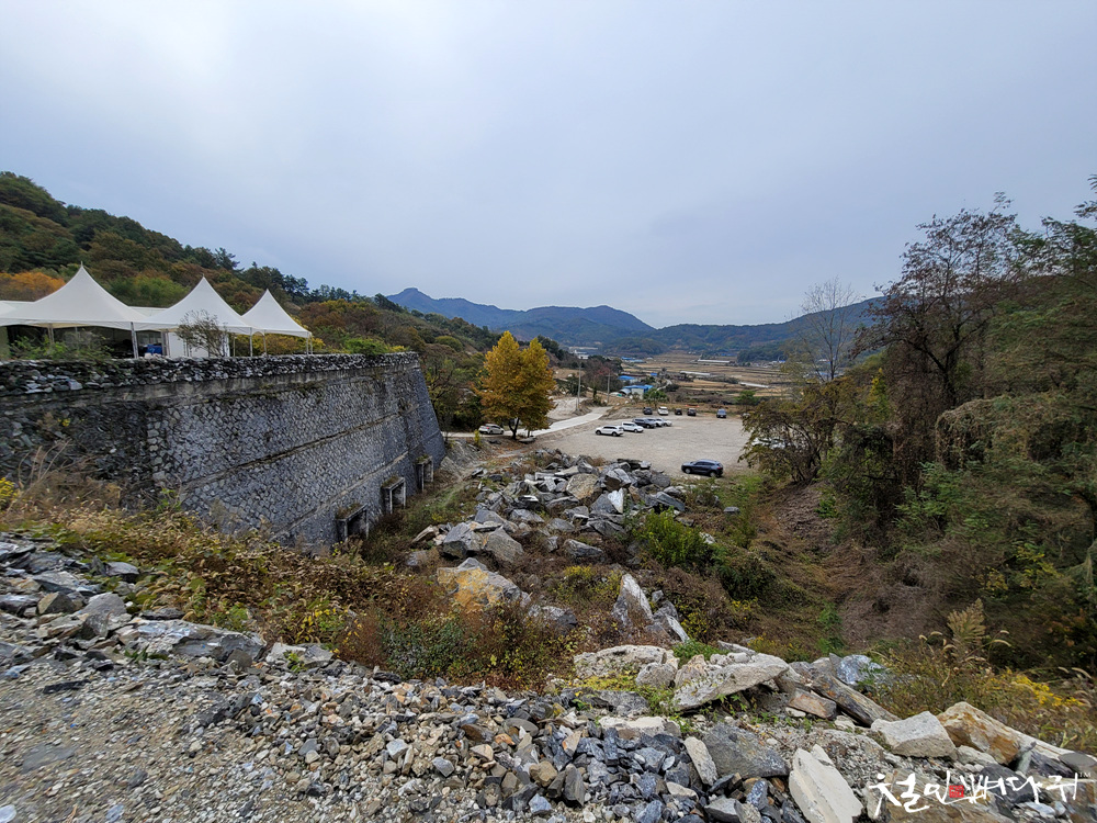주차장 옆에는 커다란 돌들이 아무렇게나