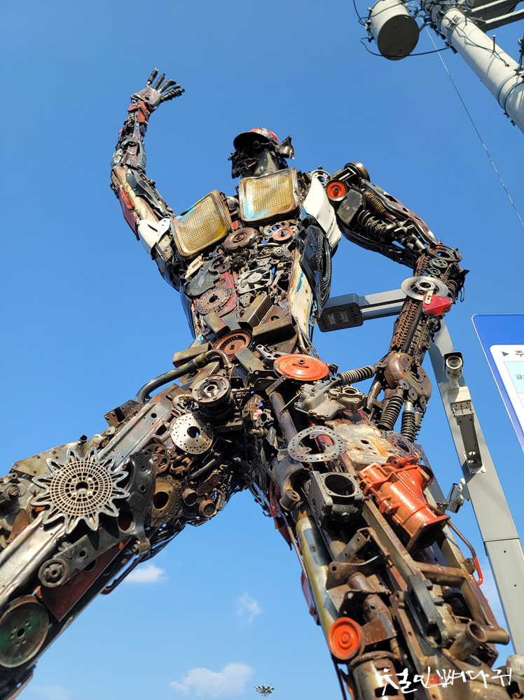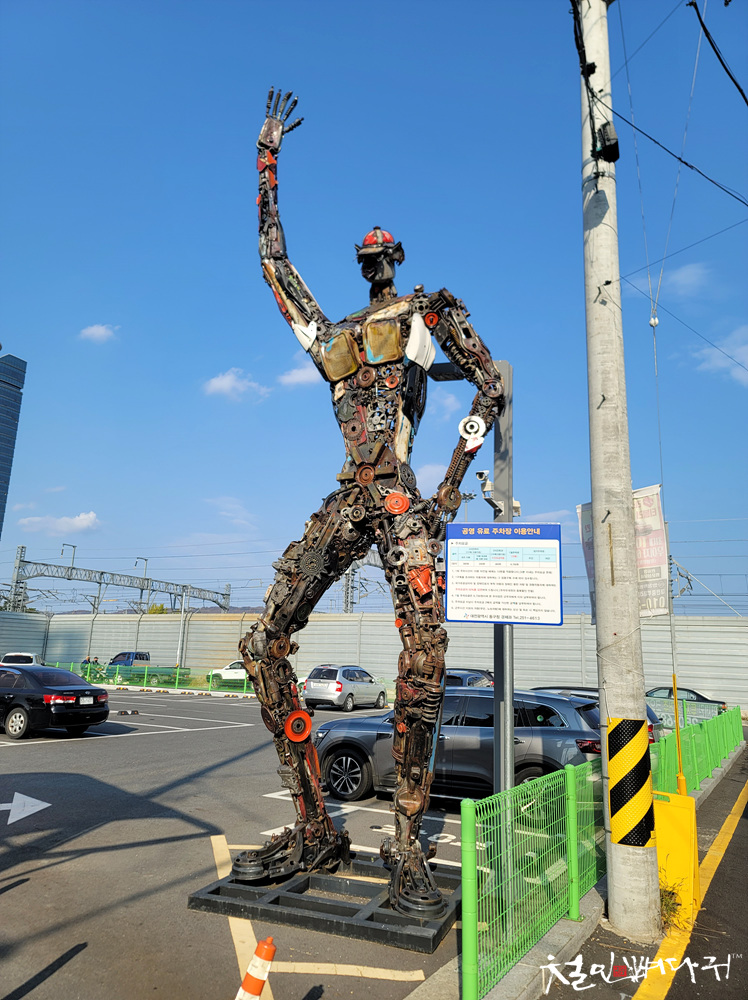 주차장 입구에는 커다란 로봇모형이 있습니다.