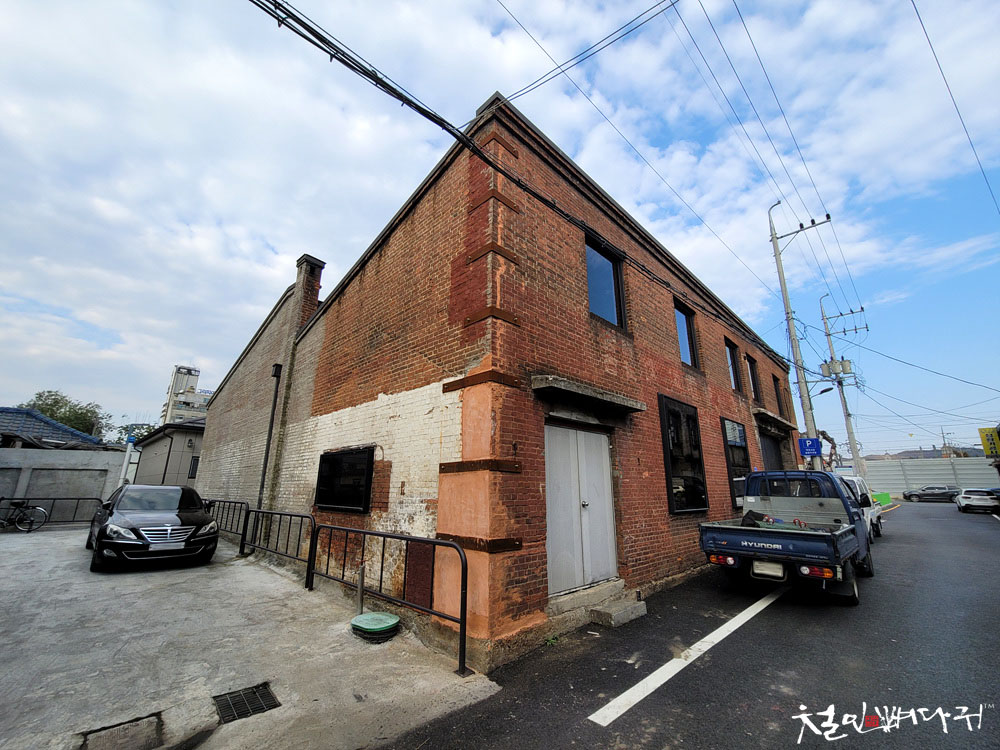 주차장 왼쪽으로 있는 빨간 벽돌 건물은