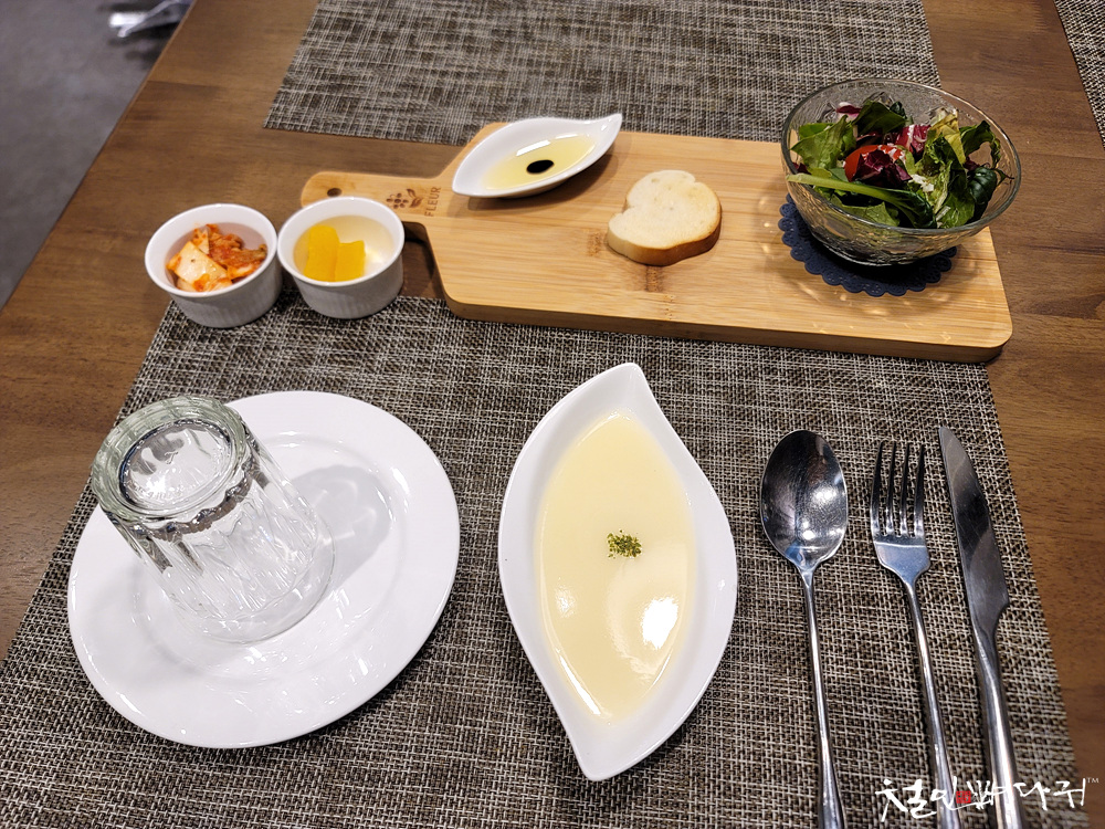 오므라이스가 나오기 전에 수프가 먼저 나옵니다.