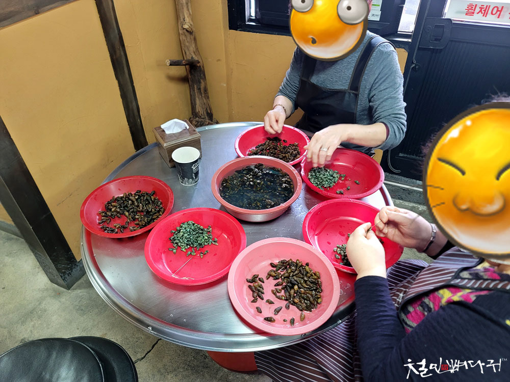 올갱이껍데기를 벗기는 작업을 하고 있었고,