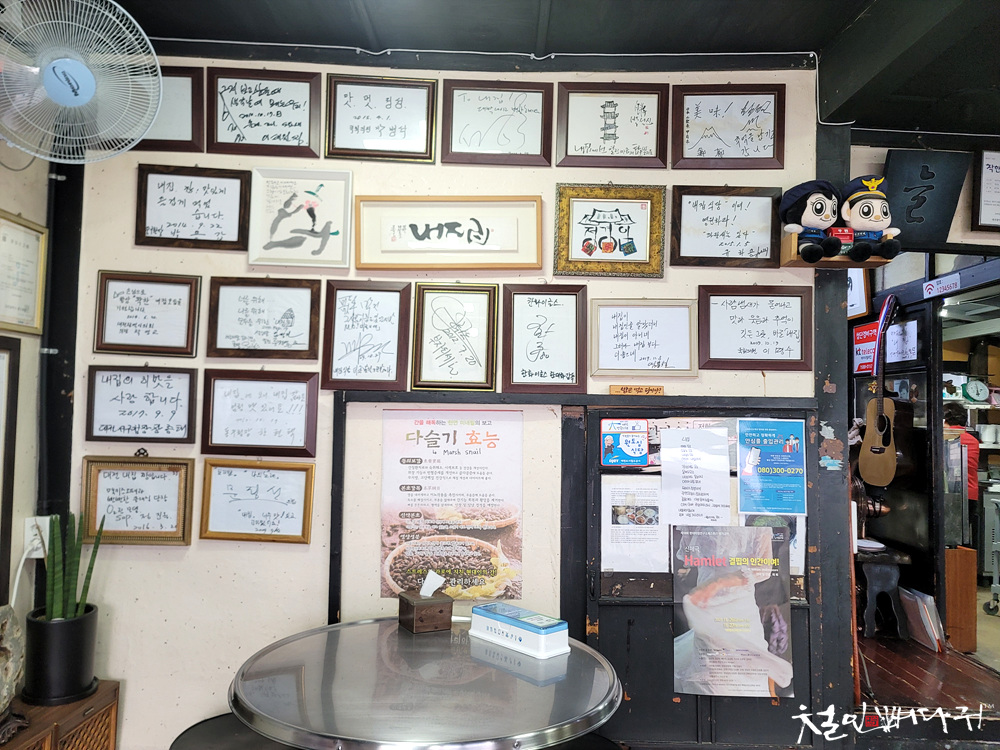 홀에 앉았는데, 유명인들 싸인액자가 많이 걸려있습니다.
