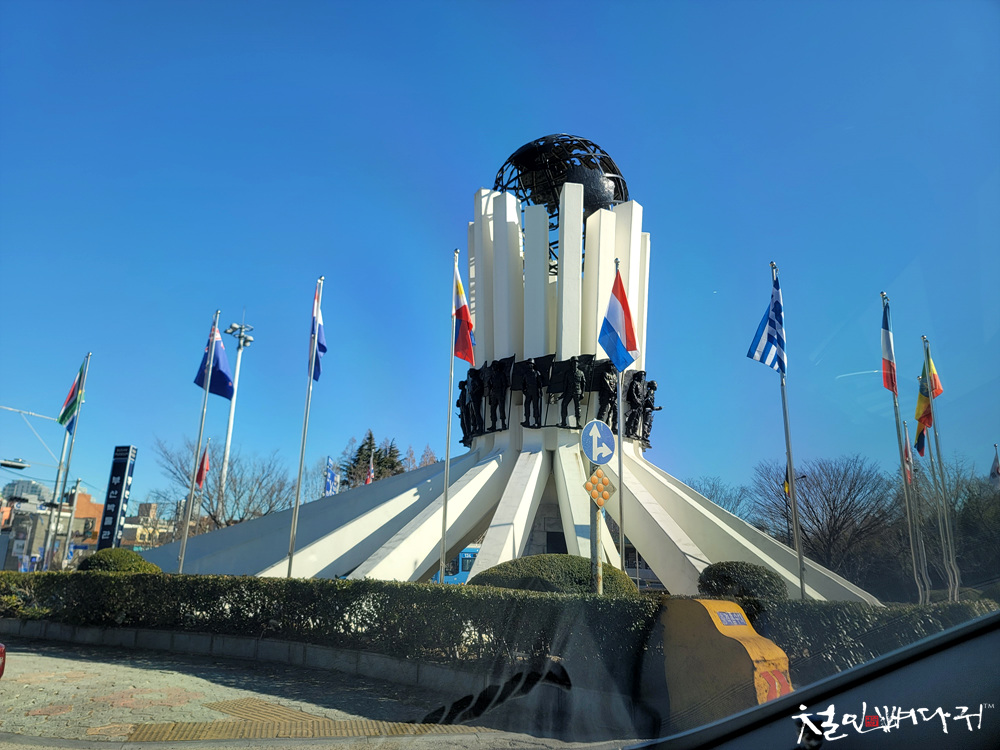 줌으로 당겨서 찍었는데, 유엔참전기념탑이 보입니다.