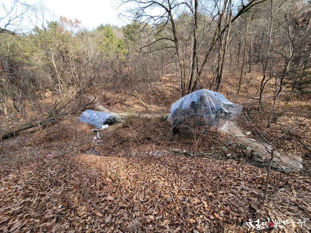 이곳에는 작은 비닐하우스가 있고, 나무에 비닐을 덮은