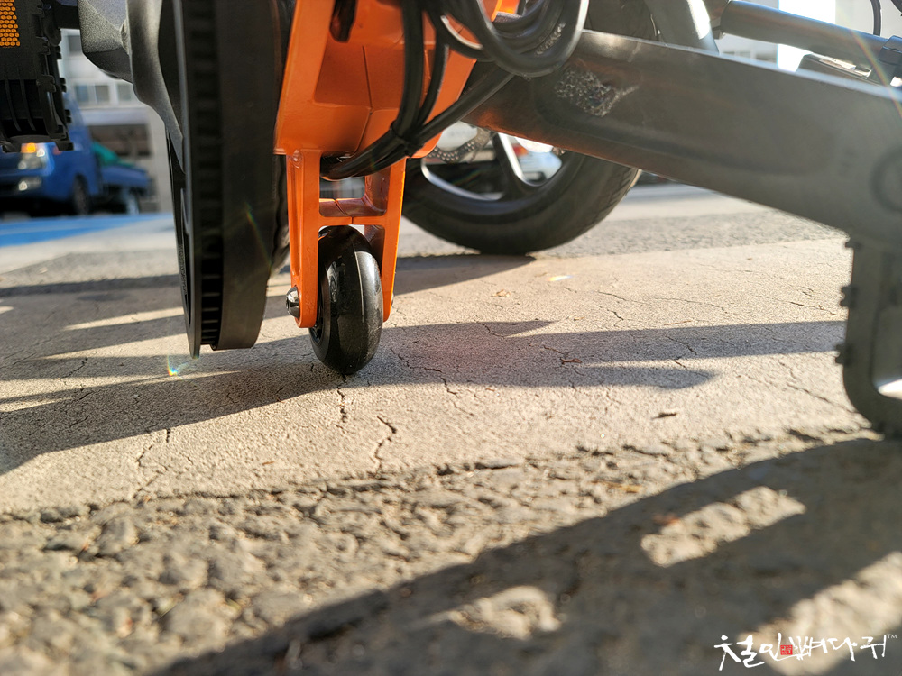 페달의 크랭크축 아래쪽에는 보조바퀴가 튼튼하게