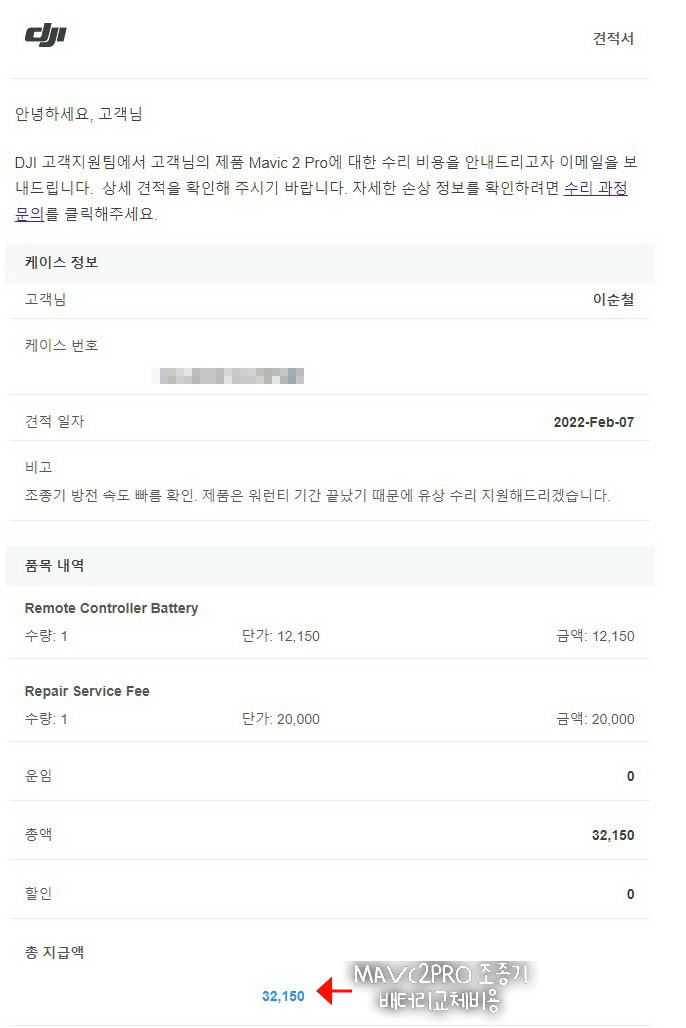 DJI가 수리할 때, 1:1 교체를 하는 정책이 있어서