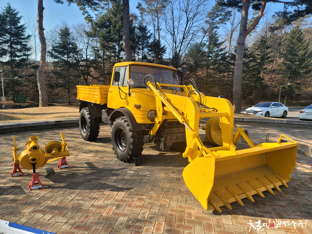 노란색으로 칠해진 버킷 달린 차량은