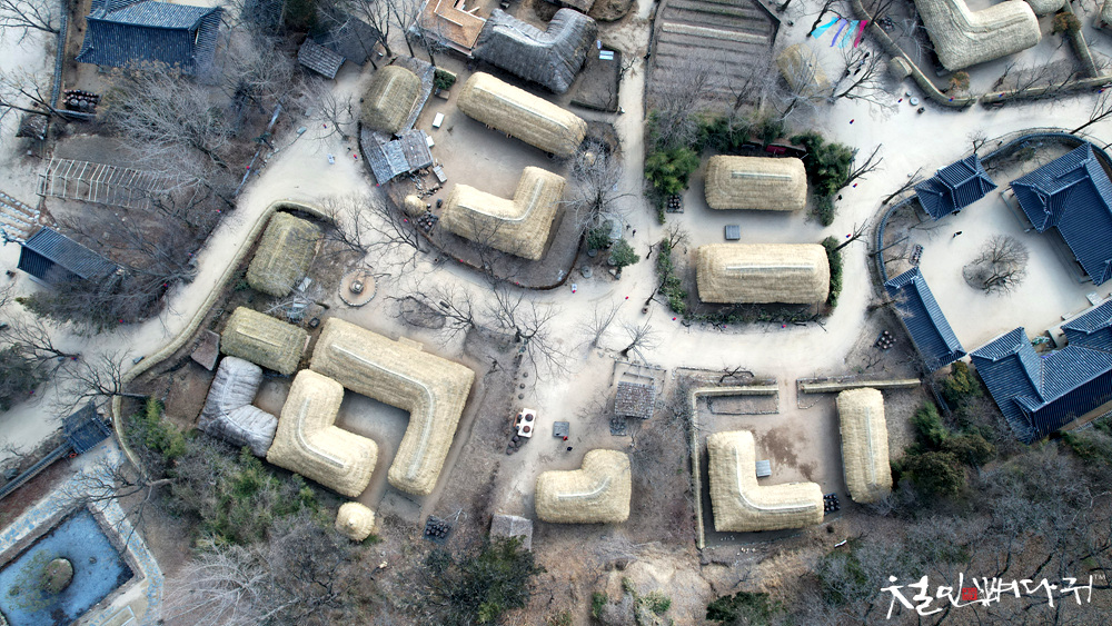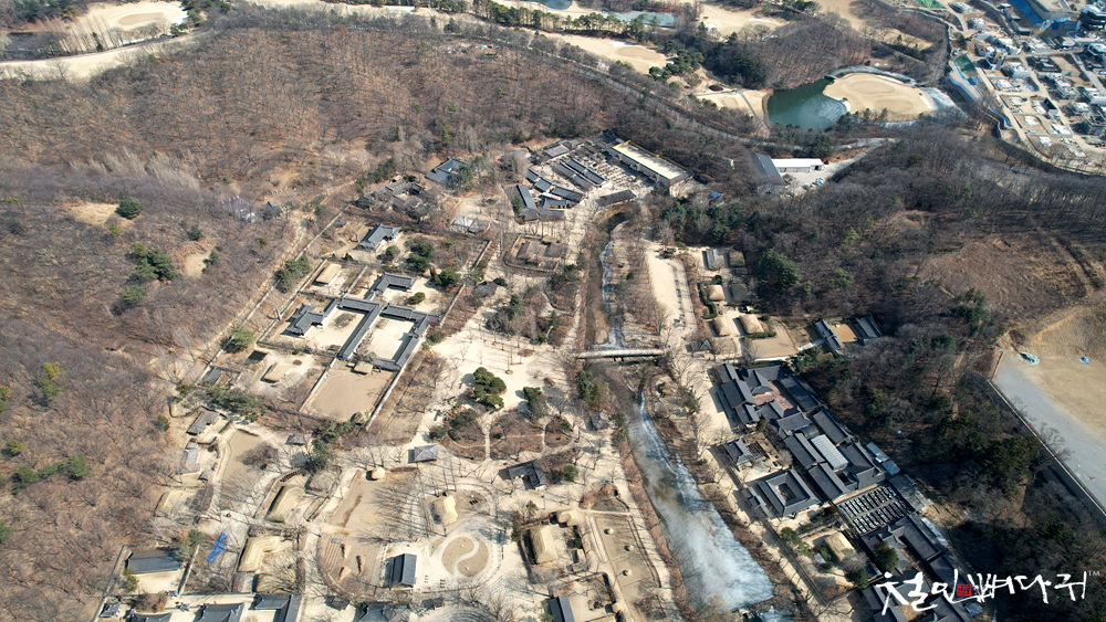 하늘에서 내려다본 한국민속촌은 초가집과 기와집들이