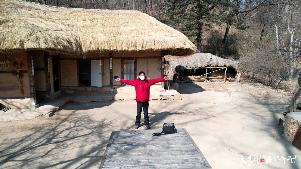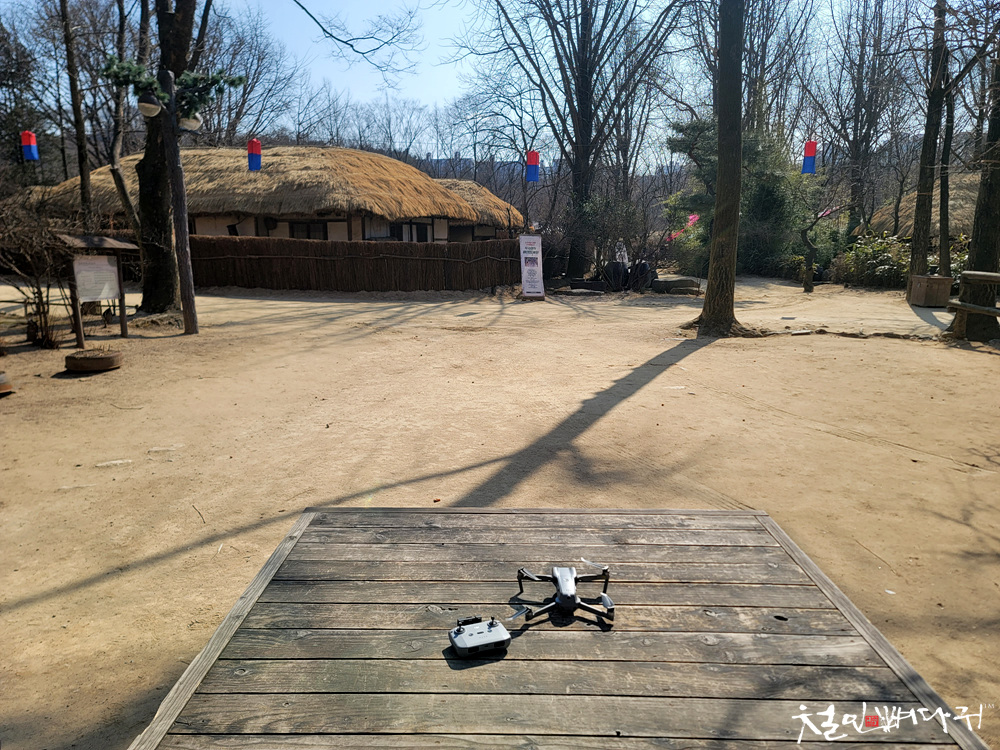 초가집의 들마루에 앉아서 드론비행을 준비했습니다.