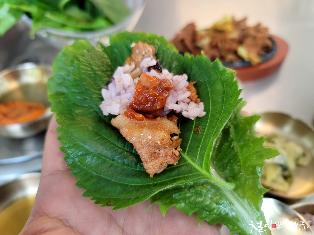 상추와 깻잎에 쌈 싸서 맛있게 잘 먹었습니다.