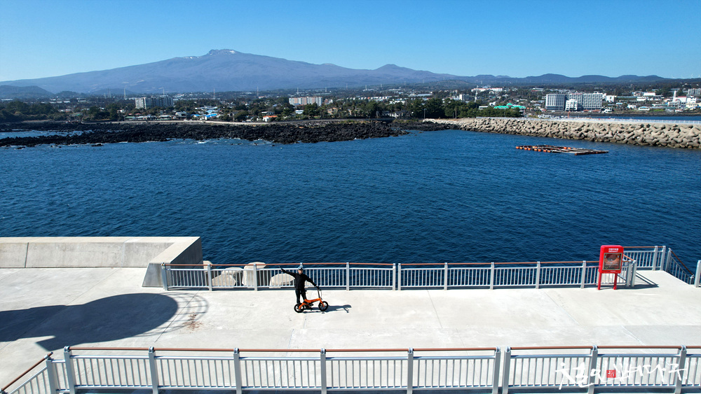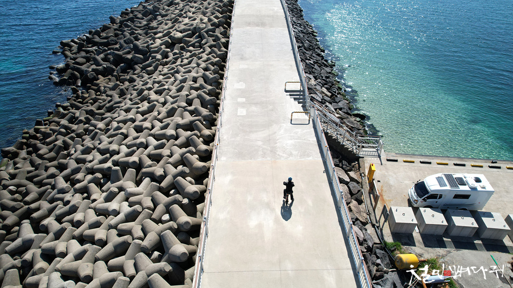 들고 올라가서, 위미항 방파제 위를 달렸습니다.