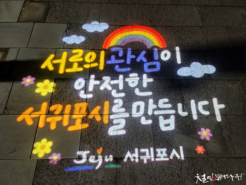바닥에 컬러로 여러 글씨를 비추고 있습니다.