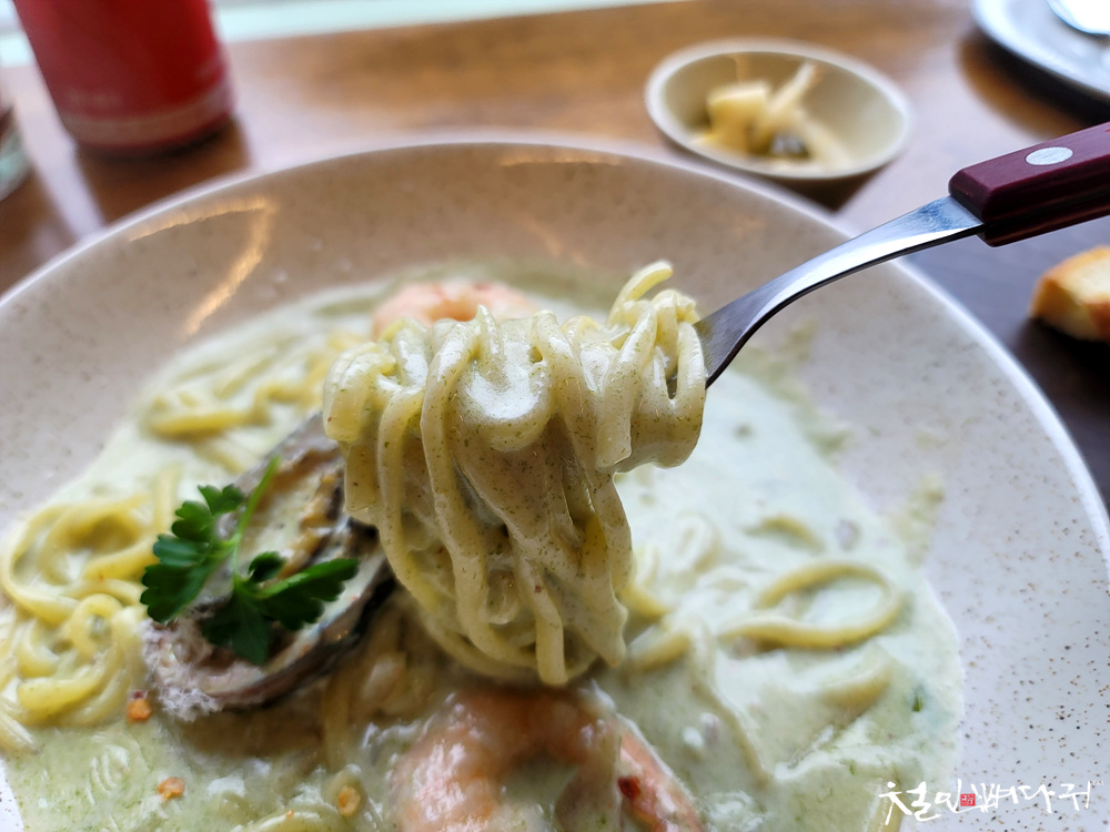 창가자리에 혼자 앉아서 감테페스토파스타를 받았습니다.