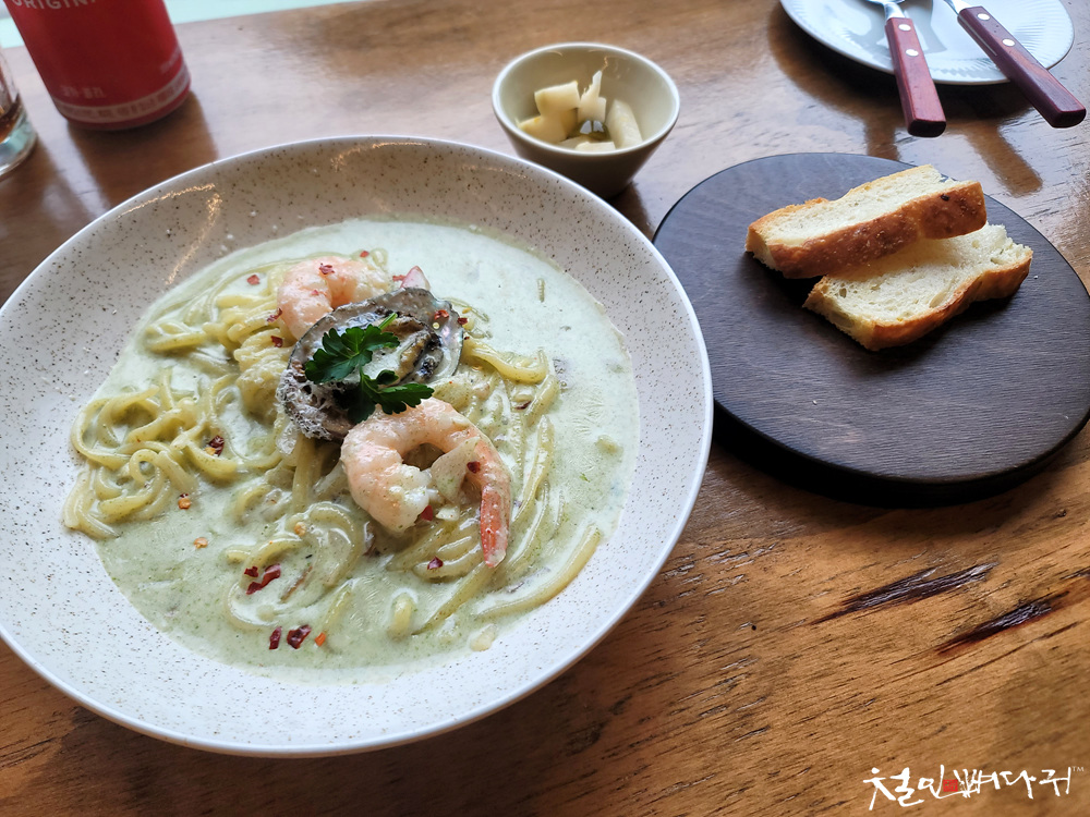 전복, 새우, 감태페스토, 크림소스, 딱새우 육수로